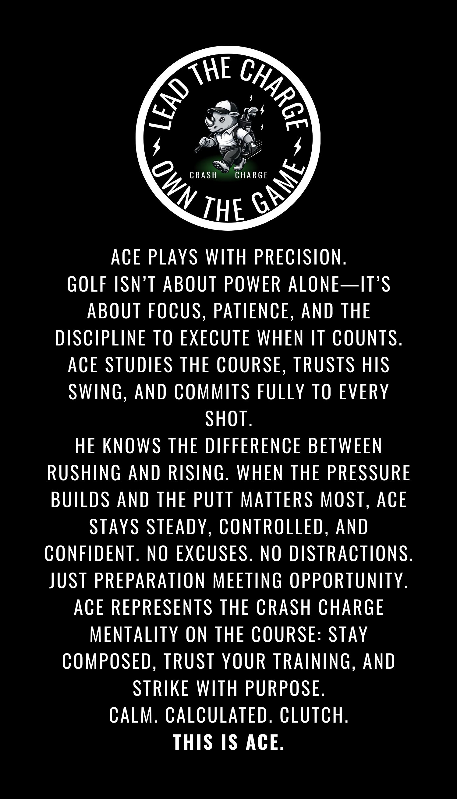 Cooling high-performance tee features the iconic Crash Charge rhino-ACE in his golf outfit and the bold mindset: “Lead the Charge. Own the Game.” This lightweight, moisture-wicking tee keeps up with every sprint, swing, and score. Designed for athletes who bring the heat and stay cool under pressure, it delivers all-day comfort and bold energy—on and off the field.